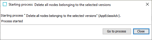 The deletion action is run as a background process, and you can access the Background Process information through the execution report. In the dialog labeled 'Starting process Delete all nodes belonging to the selected versions,' click the 'Go to process' button to navigate to the actual background process.