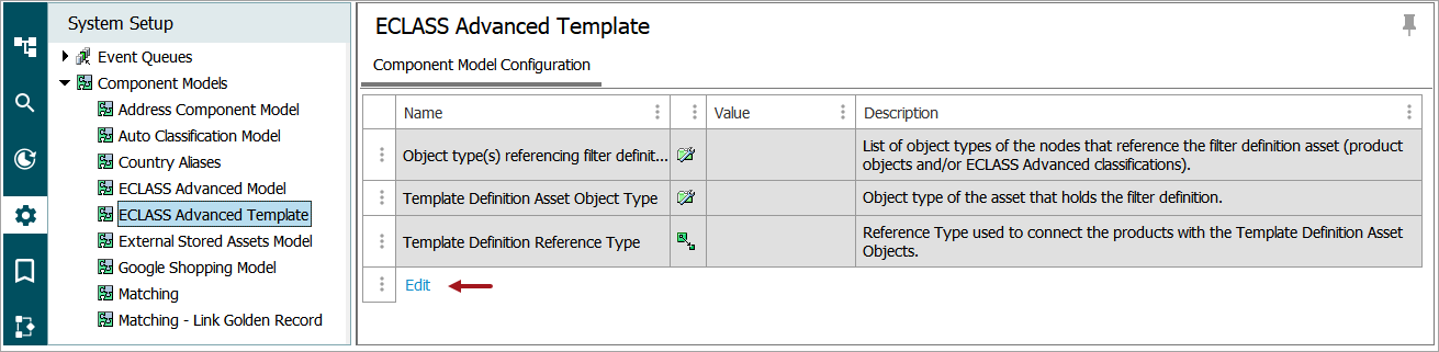 In System Setup, open the Component Models node, select the ECLASS Advanced Template node, and click the Edit link to open the editor.