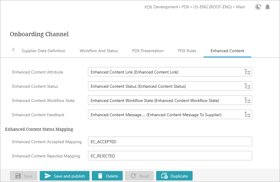 The Enhanced Content Tab of the PDX Channel Configurator contains parameters used to enable and configure the ability to receive and validate Enhanced Content from suppliers.