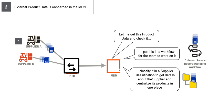 The product data received from the supplier via PDX or subscribed to and received from the GPC standard is being created Accelerator for Retail as a separate product object of the external source record in the external product hierarchy, as well as optionally separate packaging objects in the external packaging hierarchy. As part of the creation, the external source record is being initiated in the external source record handling workflow which will guide it through the different states of the onboarding process.