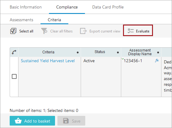 Click the ‘Criteria’ tab. On this tab, all criteria linked to all of the assessments linked to the data card will display in the table. In this step, the Sustainability Compliance Officer will review all criteria and assign values to each where appropriate. In this example, the ‘Sustained Yield Harvest Level’ criterion is assigned a ‘Pass’ value by the Sustainability Compliance Officer.