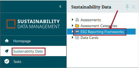 To create a structure that organizes sustainability standards and enables the solution to depict visually the connections between the standards, assessments, and Sustainability Data Cards (SDCs), users can start the process by clicking on ‘Sustainability Data’ in the Global Navigation Panel, then on ‘ESG Reporting Frameworks.’