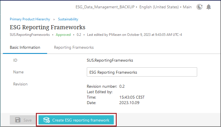 On the ‘ESG Reporting Frameworks’ screen that displays, click the ‘Create ESG reporting framework’ button at the bottom of the screen.
