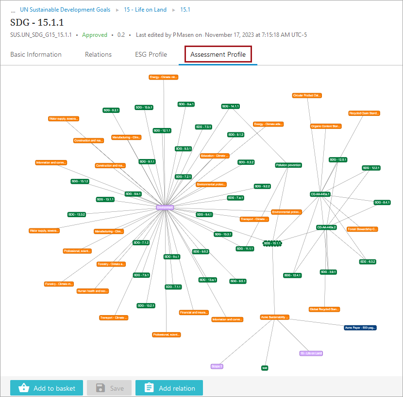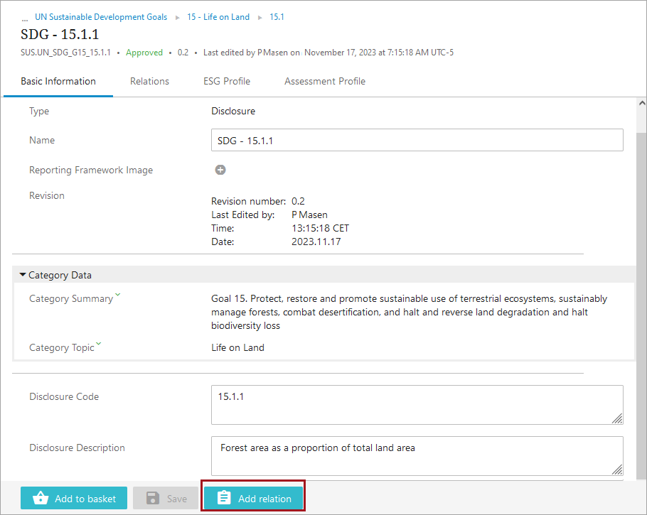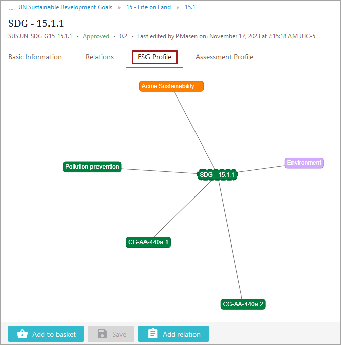 This new relation will show in a tabular format in the ‘Relations’ tab on the disclosure’s screen, and on the ‘ESG Profile’ tab, as a visual depiction of the disclosure’s connections to all related compliance objects.