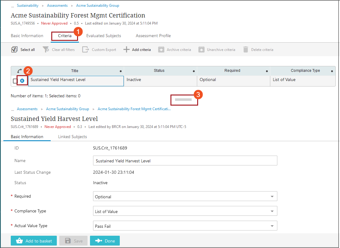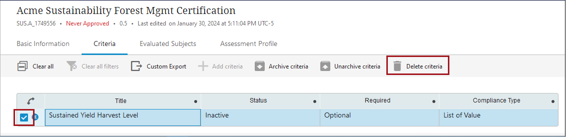 If criteria should no longer be part of an assessment’s evaluation but should be retained, those criteria can be archived. Archiving criteria retains the values stored for the criteria on Sustainability data cards while the criteria results are ignored during assessment evaluations.