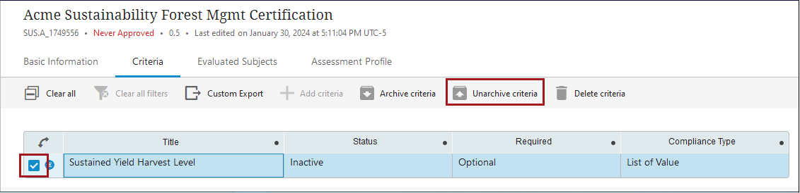 If criteria were previously archived but should now be included in the evaluation of the assessments once more, the criteria can be brought out of ‘Archived’ status, or ‘unarchived.’ Unarchiving criteria prompts the system to include the criteria during assessment evaluations.
