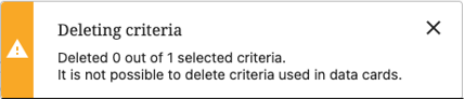 If criteria are being used in an active Sustainability data card, a warning notification will display letting the user know why the attempted deletion did not happen.