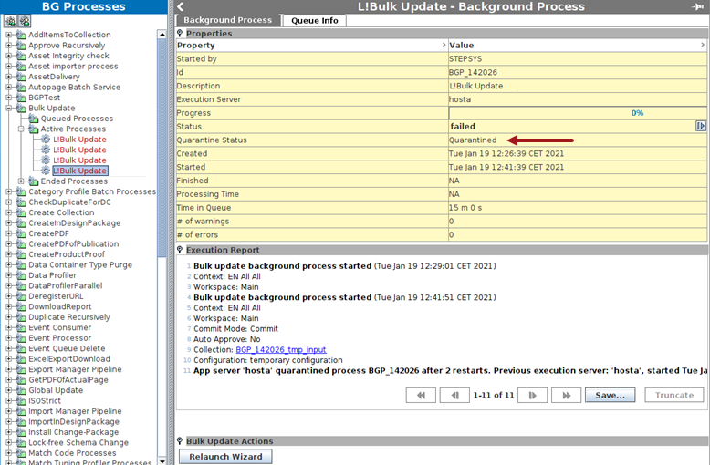 If a BGP seems to be a potential cause of an application server / node crash, STEP moves the background process into a 'failed' state and does not restart it automatically. Additionally, the BGP goes into a 'quarantined' status which requires user intervention.