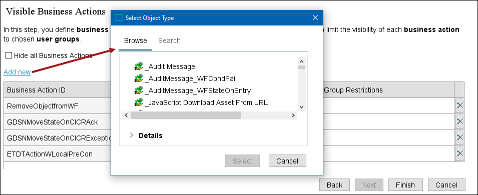 • Select the desired business actions from the 'Select Object Type' dialog (shown below) and click the Select button.