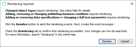 Cancel - stops the reindex process, refer to the Cancellation of Controlling Reindexing Background Process section.