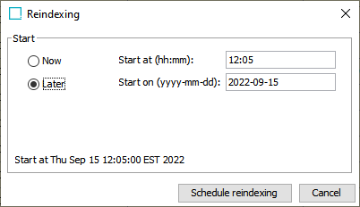 Select 'Later' to schedule the reindexing for later, and set a time for the process to initiate, then click 'Schedule reindexing'.