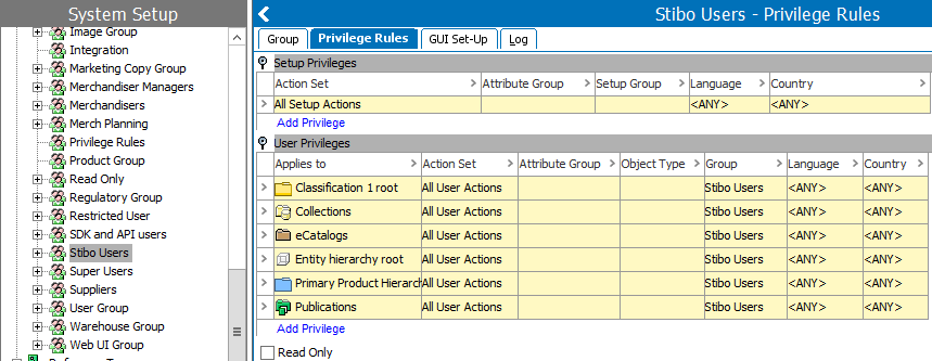 Privileges are maintained in System Setup: Privilege Rule tab in the User Group Editor.