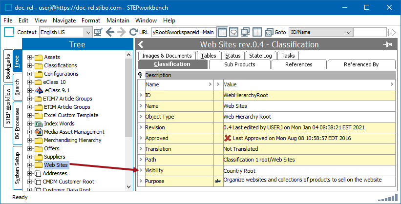 The example below shows an application where classifications have been made country-dependent, and an entire web structure has been created that is visible only in a context where English US is the selected country. The Web Sites Classification folder is not visible in the French FR context.