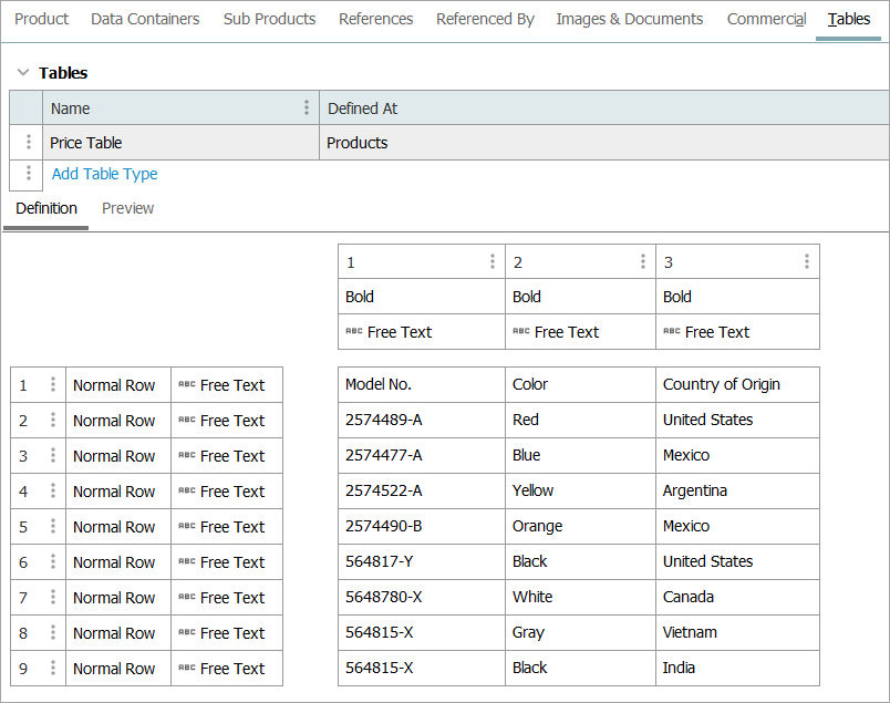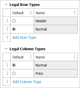 - The table type has at least one legal column type and one legal row type. If the table type uses more than one row type or column type, a default type must be specified for each.