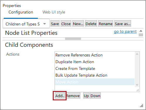 - First, add the component. Under 'Child Components' on the 'Node List Properties' screen in the designer, click the 'Add' button under the field for 'Actions'.