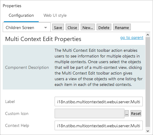 To make changes to the default button label or context help, add the custom text to the relevant fields. If nothing is added, the 'Label' default will display as 'Multi Context Editor' and the 'Context Help' default will display as 'Click to enter Multi Context Edit Mode'.