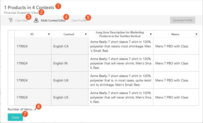 - Multi Context Edit display readout - Describes how many products have been selected for display as well as the number of contexts.