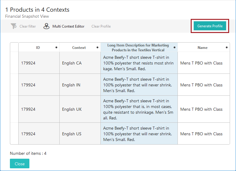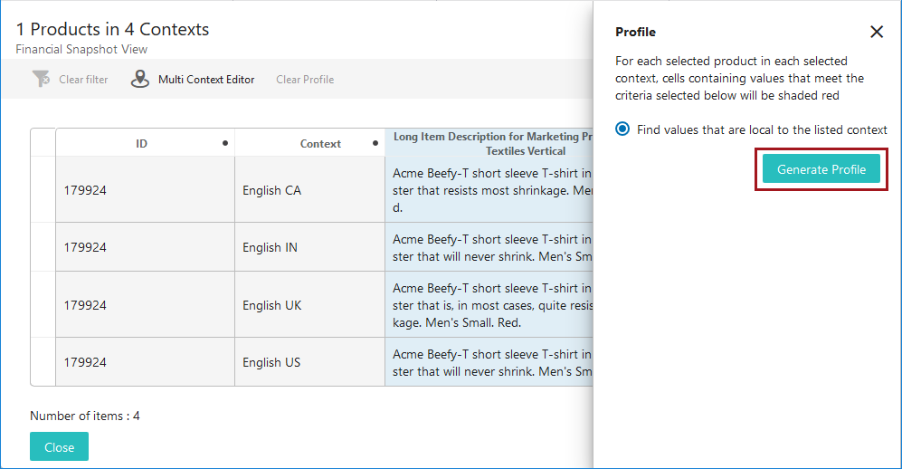 - Clear Profile - If a profile has been run on any of the columns in this view, clicking this button clears the shading the profile applies that differentiates between cell content that is local for the context and which is not. The button name also changes from 'Show Profile' to 'Generate Profile'.