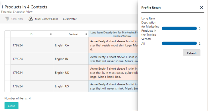 - A Profile Result panel displays the results of the data profile. The screenshot below shows the column that was profiled with the product's attributes that are local for the listed context shaded red, those that are not local to the context remaining blue-shaded.