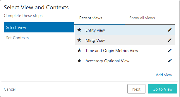By default, the last view and context combination used will already be applied when entering the 'Select View and Contexts' window. It is important to note that the 'Go to View' button will not be activated until a view and at least one context has been selected.