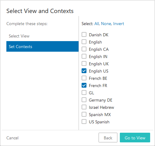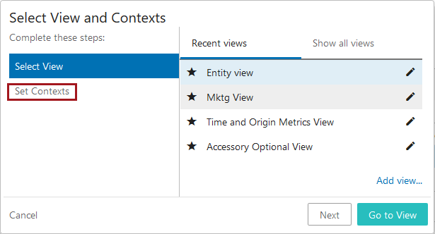 - Select contexts. To move into the context selector section of the view configuration, users may either click the 'Set Contexts' option, found on the left-hand side of the window, or the 'Next' button in the lower right-hand side of the window.