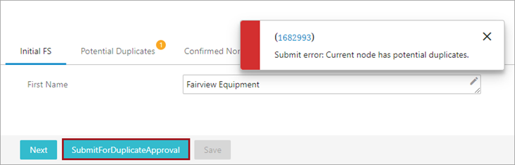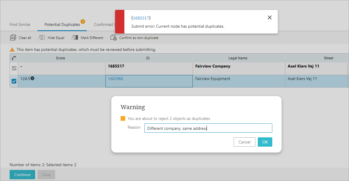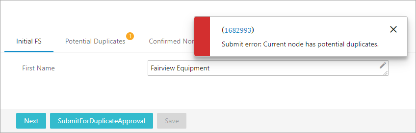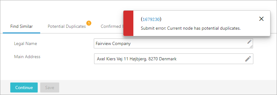 If there are no potential duplicates, the user is allowed to continue to the next screen and enter more data. In the opposite case, if the new node has potential duplicates, when clicking Continue, the user receives an error message and an error symbol appears on the 'Potential Duplicates' tab. In this case, the user now has the option to select SubmitfForDuplicateApproval, which submits the potential duplicate for duplicate approval by another user, User 2, who has privileges to decide whether the new objects are duplicates.