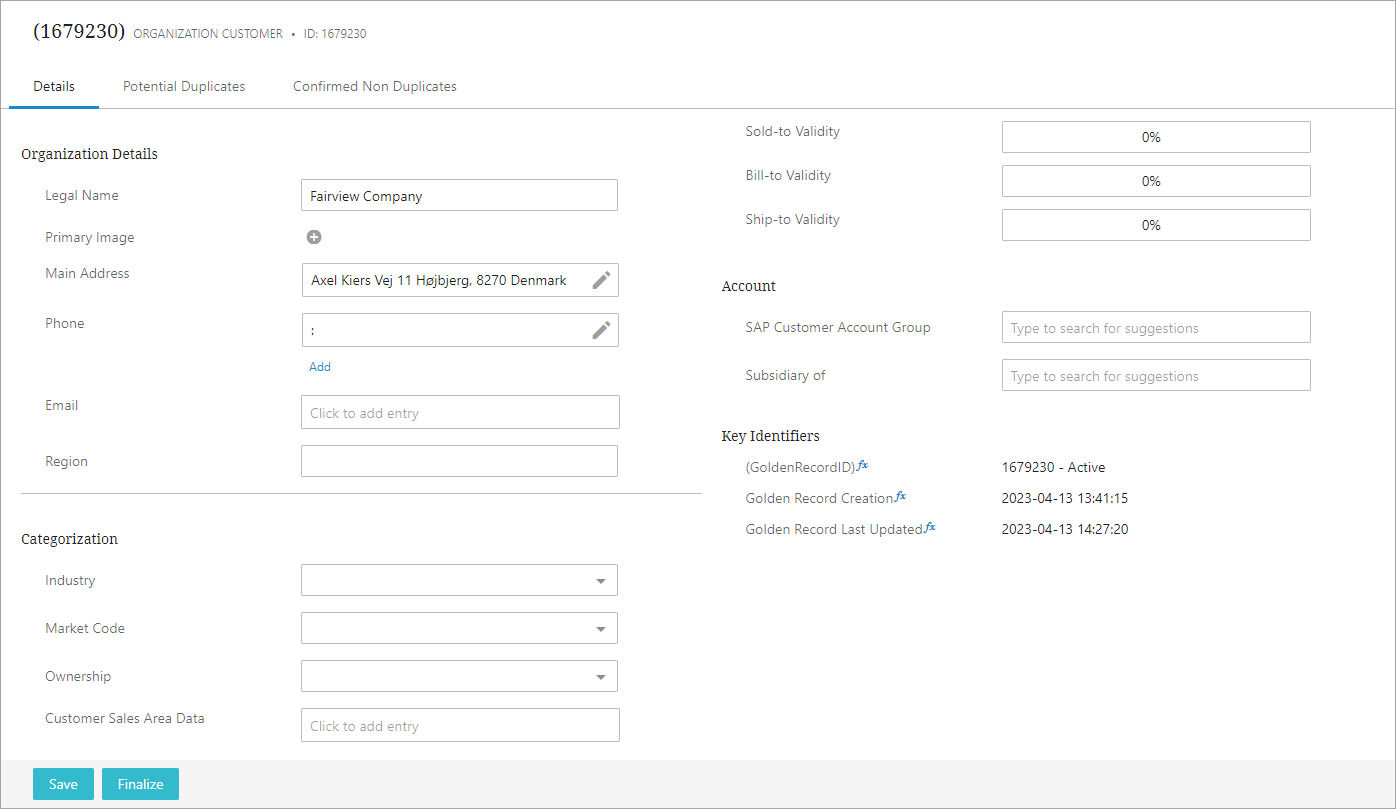 Matching algorithm - The configuration of the business condition should contain a matching algorithm that is configured and available in the global configuration ‘Matching on Save Configuration’ (mandatory). Only identifying matching algorithms are valid. When the matching algorithm is configured, all save actions in the Web UI will result in the calculation of match codes and rank scores to verify if there are any potential duplicates within the configured threshold. For more information, refer to the Configuring Matching Algorithms topic in the Matching, Linking, and Merging documentation.