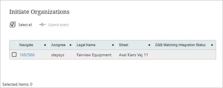 To prevent the user from transitioning to the enrichment state if there are any potential duplicates to the node, the 'No Potential Duplicates' business condition is added to the transition that is executed on submit. If there are any objects with a rank score within the configured threshold in the matching algorithm, the business condition will return 'false' and prevent transition. If it identifies potential duplicates, the user must resolve them before continuing in the workflow.