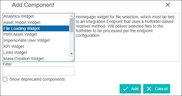 This widget is compatible with both hotfolder-based and non-hotfolder-based IIEPs. However, to use the File Loading Widget for a non-hotfolder-based IIEP, you must also configure the IIEP receiver defined in the Web UI File Loading Receiver topic in the Data Exchange documentation.