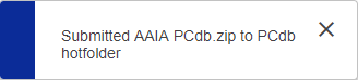 When one or more files are dragged onto a drop zone, a dialog displays at the top of the screen confirming the file(s) has(have) been submitted. In the example below, one file was dragged onto the PCdb drop zone, and the dialog displays that the 'AAIA PCdb.zip' file has been submitted to the 'PCdb' hotfolder.