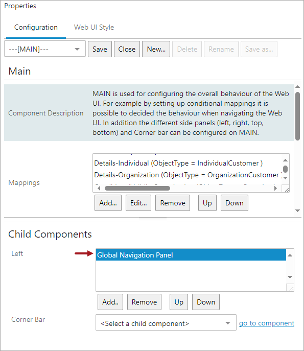 In the Designer, navigate to the 'MAIN' menu and double click on Global Navigation Panel option in the Left field.