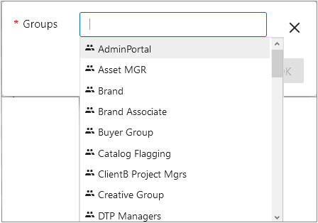 - Groups - Click into this field to view a list of all available user groups to which the new user can be assigned. Admins may select as many user groups for the new user as needed. Users must select at least one user group for this field.