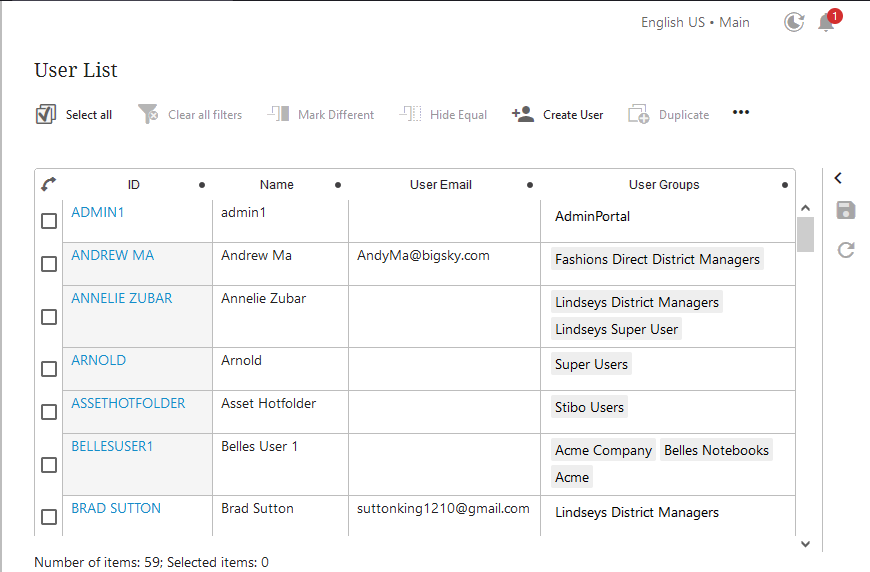 Note: To prevent memory and performance issues, the maximum number of users displayed in the User List screen is 10,000. This functionality is managed by a configuration property that is not available in the Self-Service UI. Contact Stibo Systems Support for assistance. This maximum can be amended to be less than 10,000 via the Portal.MaxResultCount configuration property. Once the number of users exceeds the configured maximum (though the maximum cannot be set to a number above 10,000), the sorting and filtering functionality in the User List Screen is disabled. To search for users when the maximum has been exceeded, users should access the Advanced Search screen and apply search criteria that narrows the returned list of users to a number less than 10,000. As an example of how to accomplish this, users can deploy the 'Search from List' criterion and paste in a list of user IDs or Names to search. Or users can deploy the 'Object type' search criterion, set the value to 'User', and add the 'Name, ID and Attribute value search' criterion to narrow down the list. For more information on the Advanced Search screen, refer to the Advanced Search topic.