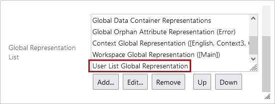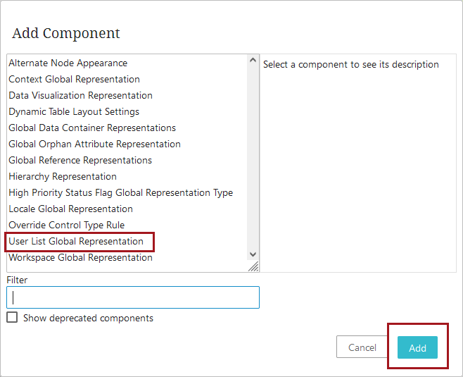 From the list that displays in the 'Add Component' dialog, select 'User List Global Representation' and click the 'Add' button.