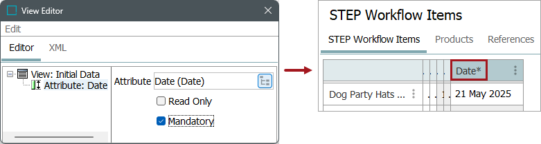 Note: The Mandatory checkbox in view configuration provides a visual indicator only—it does NOT enforce that the attribute is populated. If the attribute must be populated prior to exiting the state, the attribute must be marked as mandatory using the Mandatory Data tab of the state or transition editor. More information on this is available in the Mandatory Attributes, References, and Variables in Workflows topic.
