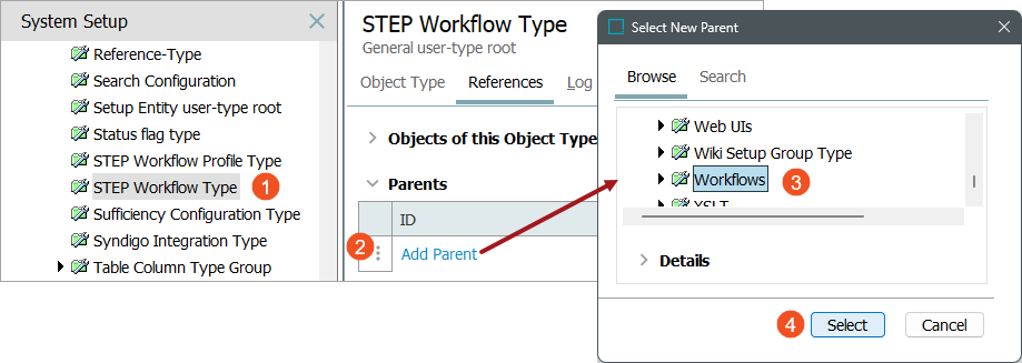 Return to Object Types & Structures, open Basic Object Types, and open the STEP Workflow Type node. In the corresponding editor, select the References tab and select Add Parent to link this to the folder created for workflows under Setup Group type root. This enables workflow objects to be created as children to the Workflows setup group root.