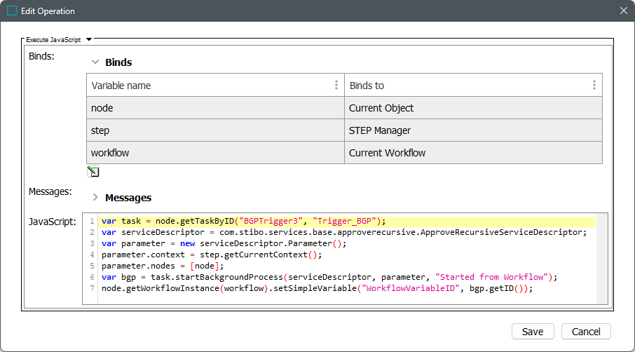 var task = node.getTaskByID("WorkflowID", "WorkflowStateID"); var serviceDescriptor = com.stibo.services.base.approverecursive.ApproveRecursiveServiceDescriptor; var parameter = new serviceDescriptor.Parameter(); parameter.context = step.getCurrentContext(); parameter.nodes = [node]; var bgp = task.startBackgroundProcess(serviceDescriptor, parameter, "Started from Workflow"); node.getWorkflowInstance(workflow).setSimpleVariable("WorkflowVariableID", bgp.getID());